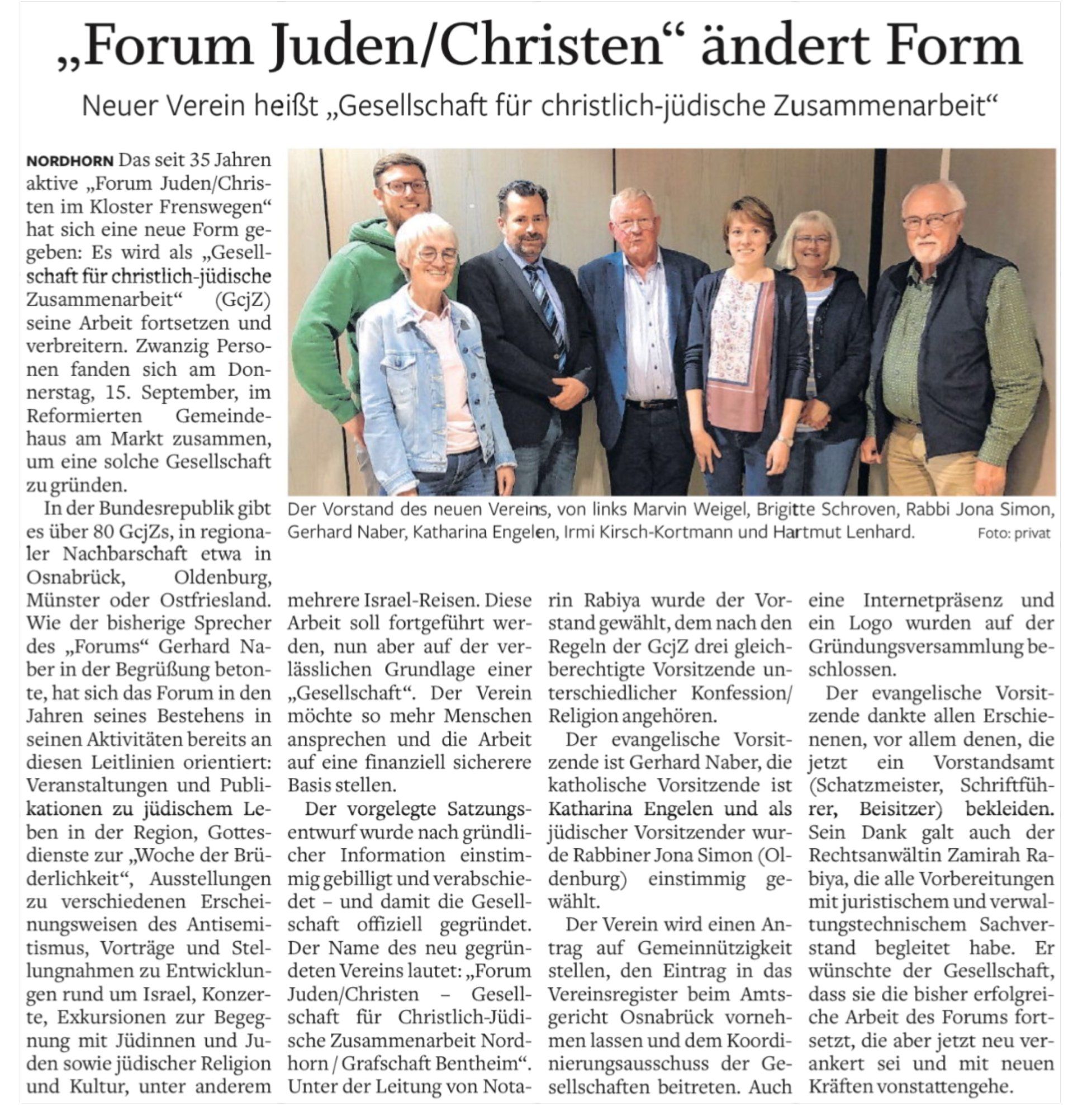 Das Forum Juden/Christen besteht seit 1987 im Kloster Frenswegen. Nach 35 Jahren haben sich die Mitglieder entschlossen, einen eigenen Verein zu gründen. Am 15.9.2022 war es so weit. Der Verein "Forum Juden / Christen - Gesellschaft für Christlich-Jüdische Zusammenarbeit" wurde ins Leben gerufen. Am 13.10.2022 erfolgte die Eintragung ins Vereinsregister, am 29.9. wurde die Gemeinnützigkeit des Vereins anerkannt.